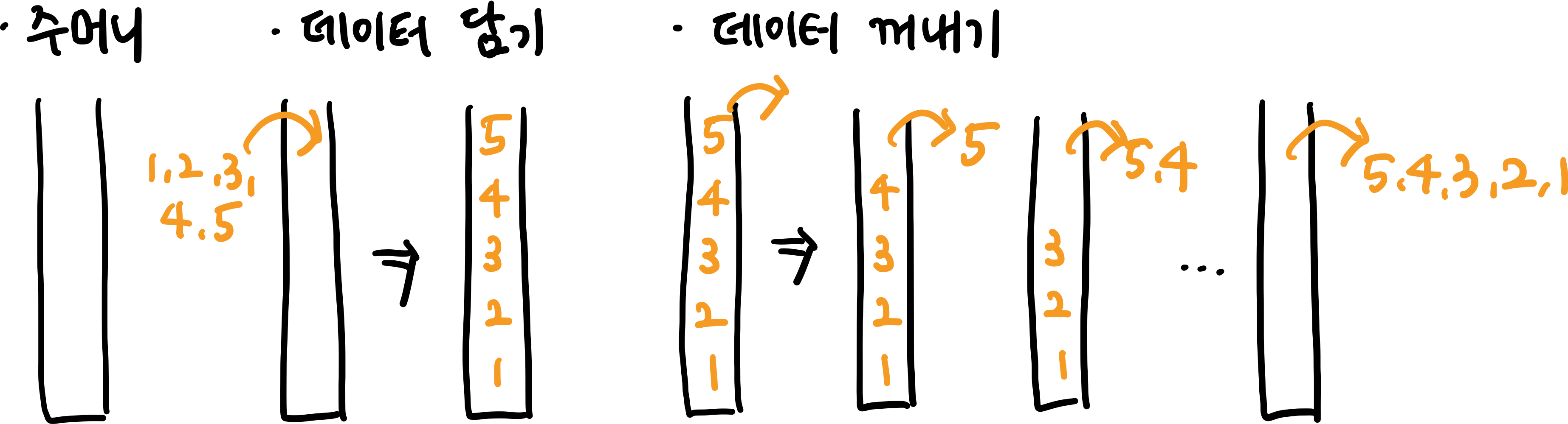 나중에 들어온 데이터가 먼저 삭제되는 후입선출 구조의 자료구조이다.