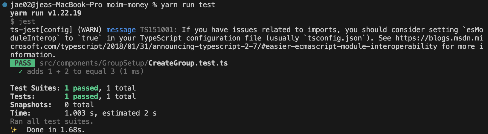 나는 yarn을 사용했고, yarn run test를 입력하면 테스트 코드가 실행된다.