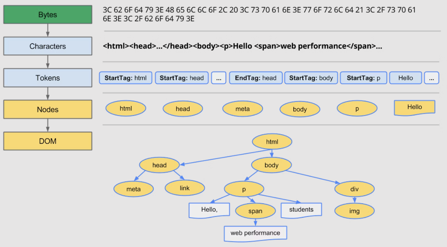 데이터를 파싱 하여 DOM Tree를 생성하는 과정은 위 이미지와 같다.
